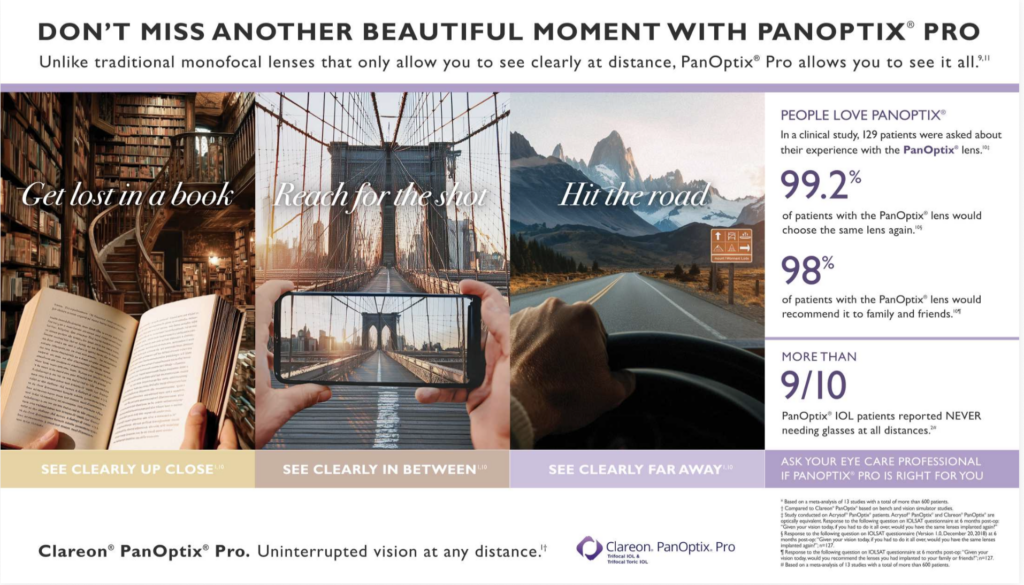 The Clareon PanOptix Pro lens is the first and only trifocal lens in the United States. The technology has already been used successfully in countries around the world. It is changing live and redefining post-cataract surgery outcomes for patients.